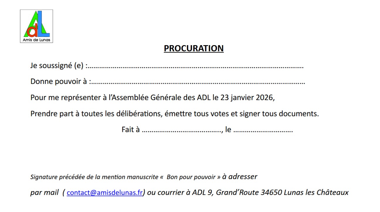 Vous ne pouvez participer à l'assemblée générale du 23 janvier 2026 à 18 heures ... Imprimez, complétez le pouvoir ci-dessous. Retournez-le par email ou courrier à "Association des Amis de Lunas, 9 Grand'Route, 34650 LUNAS-les-Châteaux" |