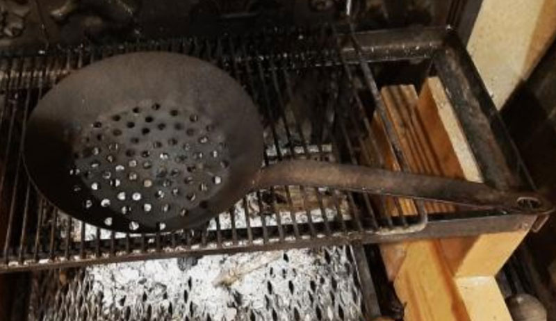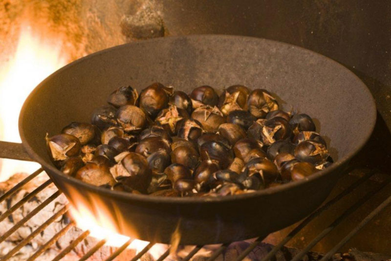 Mon père disait : « Pour réussir une bonne biroulade, il faut faire suer les châtaignes pendant la cuisson ». Pour obtenir ce résultat, il suffit de jeter dans le feu bien attisé un bouquet de ramure pas trop sèche afin que la vapeur d’eau dégagée imprègne le fruit. Dans le but d’uniformiser la cuisson, une main experte remue la poêle, faisant rouler les marrons sur eux-mêmes et, au bout de quelques minutes, ils sont carbonisés. Les plus adroits ravissaient les curieux en faisant sauter et virevolter les châtaignes dans la poêle comme le ferait un breton cuisant une crêpe. Quand, à l’œil, la cuisson paraît terminée, le maître des lieux s’assure du moelleux de la chair en prélevant un échantillon. C’est lui qui, mettant en jeu sa réputation, décide que le processus est terminé, et, joignant le geste à la parole, verse les châtaignes brûlantes dans la paillasse puis les recouvre d’un vieux pull en laine. Ainsi couverte la biroulade va se confire et se refroidir un peu avant d’être consommée. En attendant la dégustation, Maurice ouvre une bouteille en guise de mise en bouche, remplit les verres alignés sur la table, puis prenant le sien, porte un toast, en le levant bien haut en direction de ses invités.